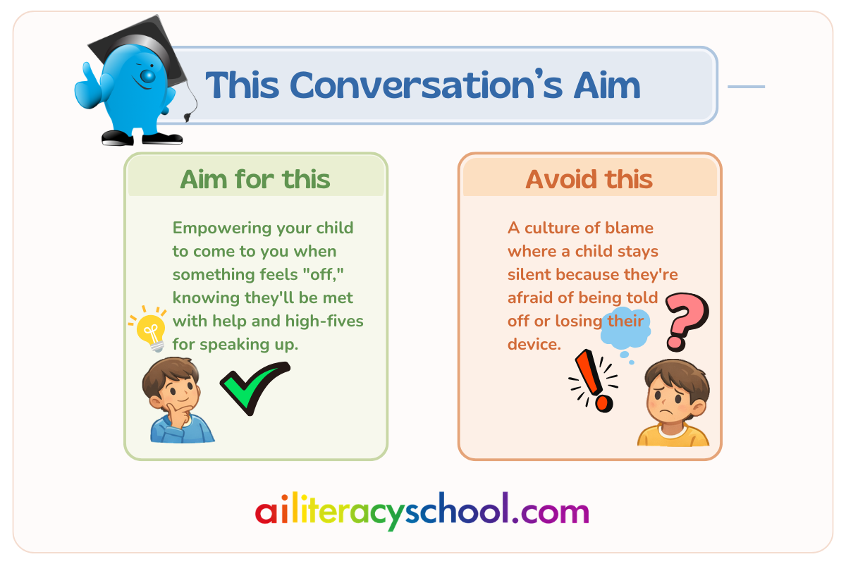 We need to prepare our children for occasions where they encounter AI outside the safety of your supervision or guardrails. A calm conversation at home helps your child know that they do not need to handle a strange or upsetting AI interaction on their own. It also helps them learn that speaking up is a good step, not something that gets them into trouble.