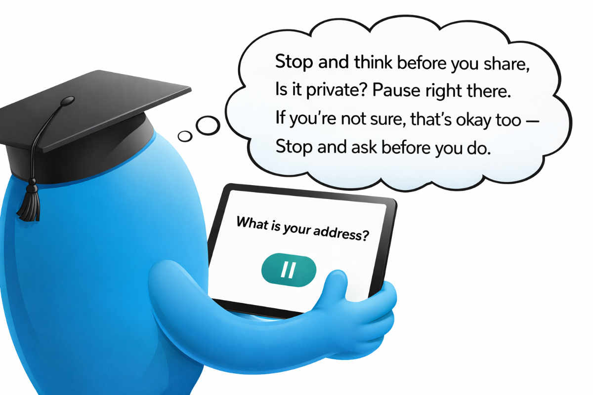 This is the technique we use in our Safe AI Step-by-Step Learning Plan to help children remember to think before sharing private information online or with AI: