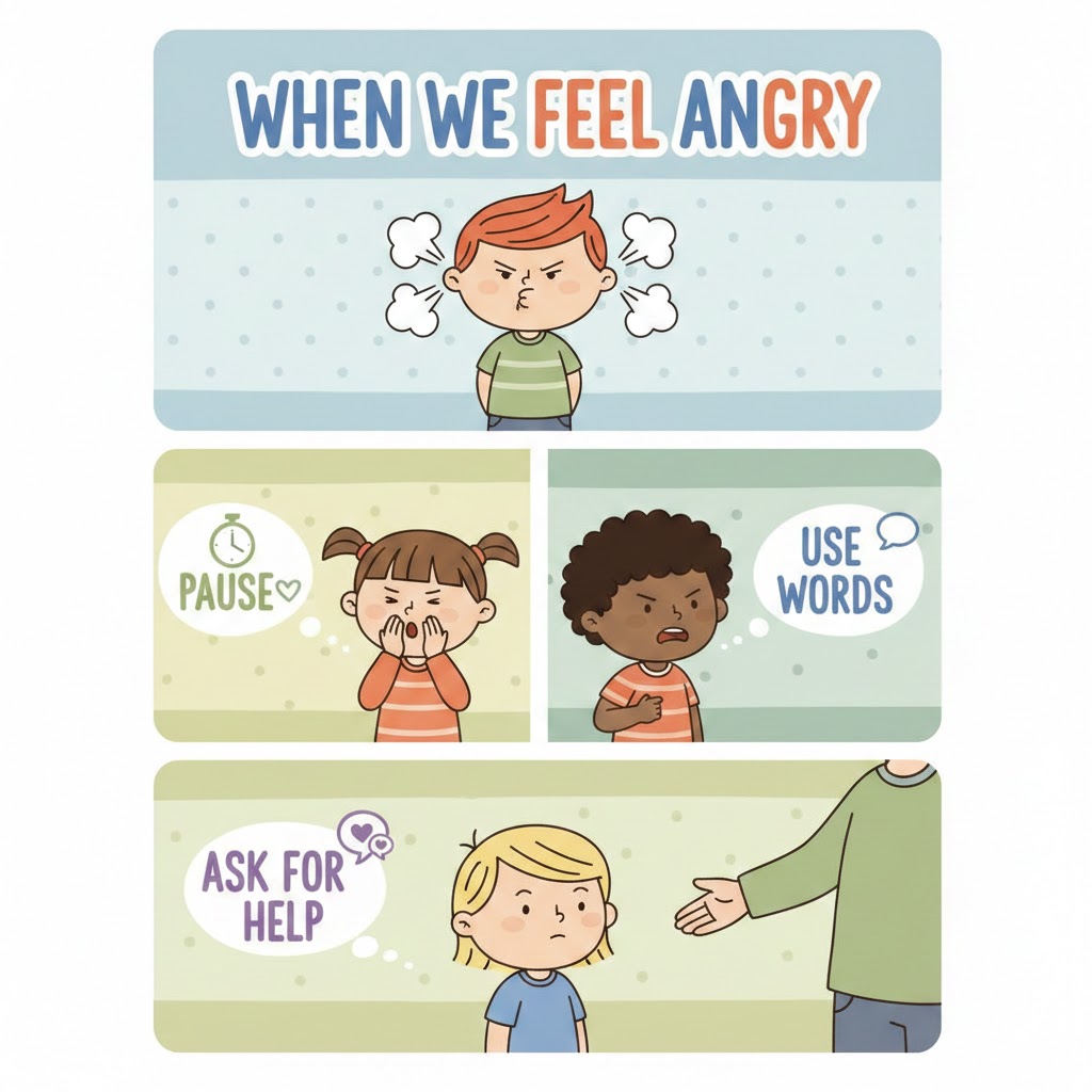 - Message: Title ‘When We Feel Angry’ with 3 choices: pause, use words, ask for help