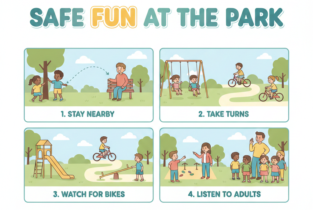 Message: Title ‘Safe Fun at the Park’ with rules about staying nearby, taking turns, watching for bikes, and listening to adults
