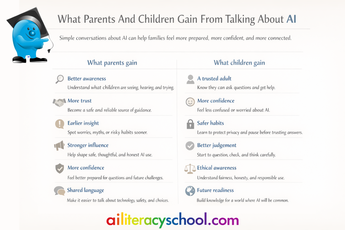 Talking about AI helps children feel safer, more confident, and better prepared. It also helps parents guide children towards using AI in ways that are safe, sensible, and kind.